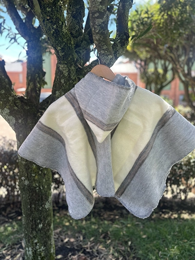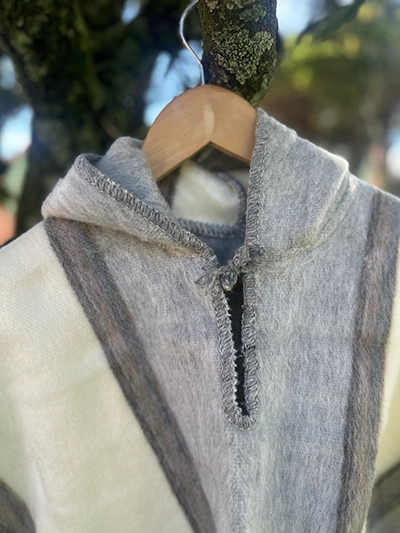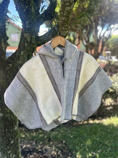Ruanita en lana industrial, con gorrito, que la hace mas abrigadora. Tejida con mucho amor y dedicación, por artesanos nobsanos. Las medidas de la ruanita extendida son de 55 cm de ancho x 90 cm de largo.